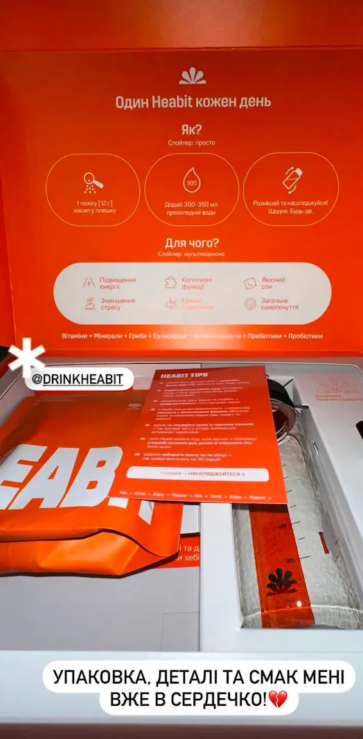 Також можеш міксувати суміш із іншими напоями і навіть створювати власні рецепти хелзі-коктейлів. Головне — не варто змішувати Heabit із гарячими напоями, аби максимально зберегти всі корисні властивості дрінку.